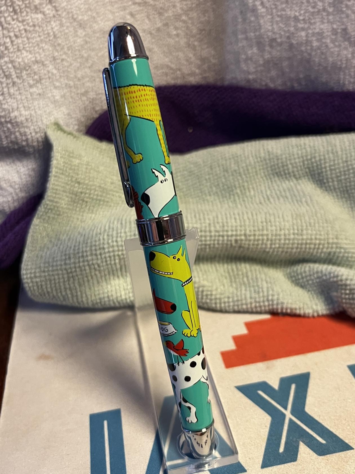 "Dogs" Rollerball Pen, an archived design by Nancy Wolff, comes from ACME Studio's Standard Rollerball Pen collection. The artists signature is printed on the centre band, and "ACME" is stamped on the pocket clip. The background color is teal green with various cartoonish dog & supporting images all about the length of the pen. A very fun addition to any collector's stash.