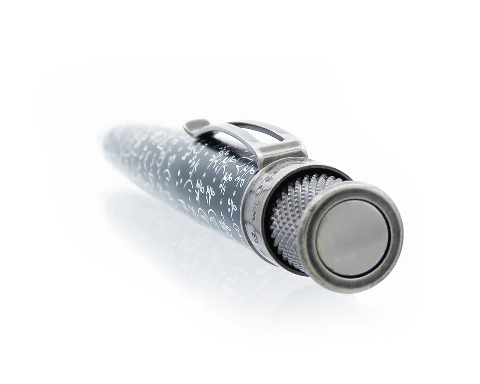 The Albert rollerball pen is designed with a sleek matte black lacquer finish over stainless steel. It features antiqued trim and Einstein's famous equations written in white, including the iconic mass-energy equivalence equation: E=mc2.