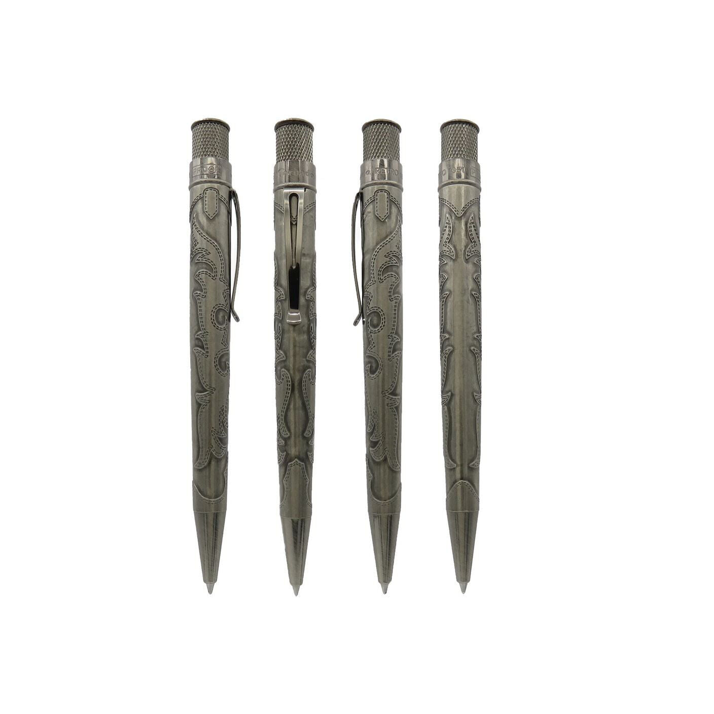 This exclusive offer presents an unparalleled opportunity to acquire the highly coveted Retro 51 Tornado Limited Edition "Wrangler" Rollerball Pen. Expertly crafted to showcase the essence of cowboy culture, the pen boasts a stunning acid etched barrel, reminiscent of a pair of intricately designed cowboy boots, complemented by a star adorning the top disc.